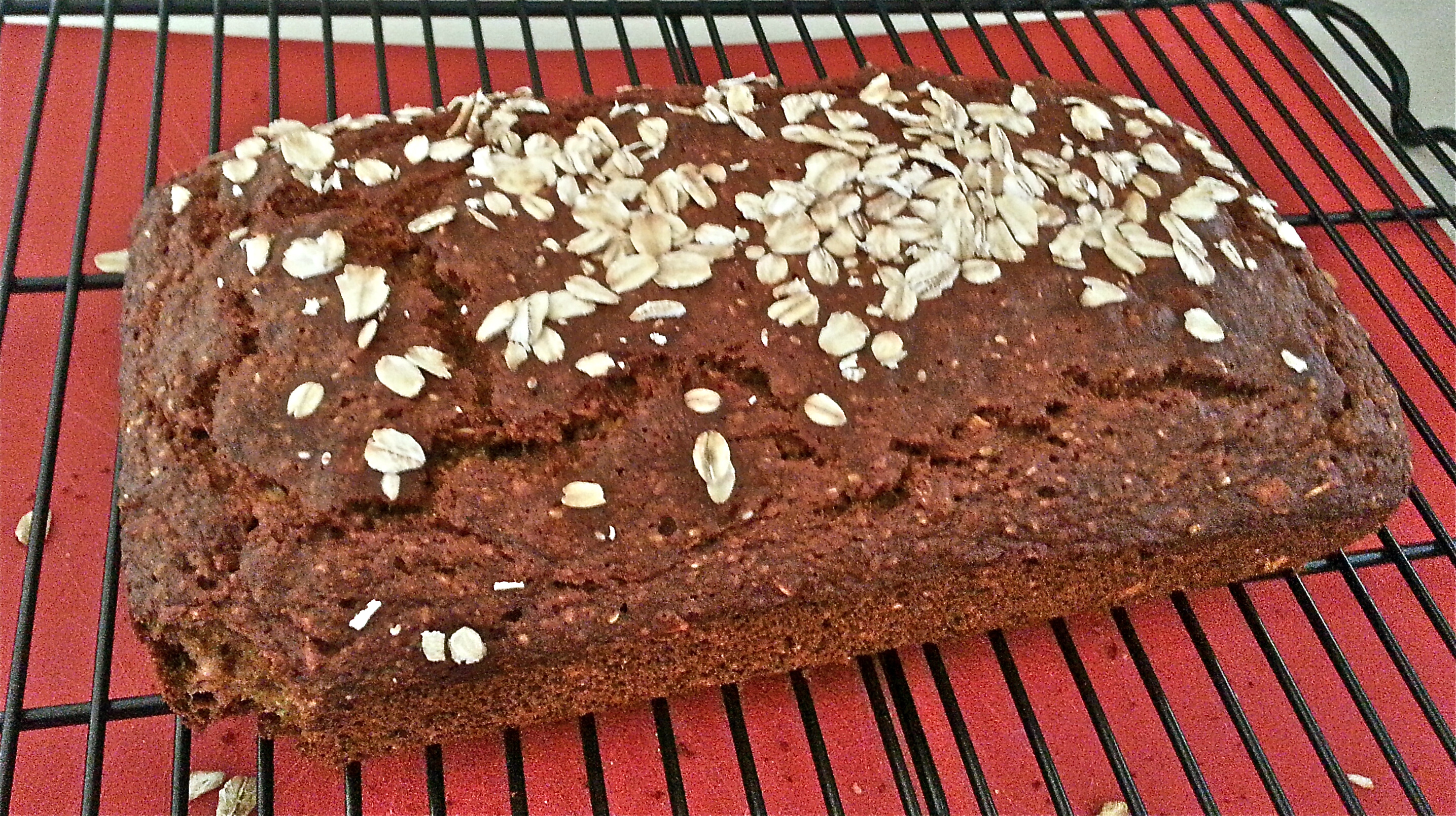 I know it sounds like a lot of crazy stuff but that’s just what I had on hand. I cut the sugar in half since the banana is usually sweet enough for me. The chia seeds just add extra crunch and fiber. The mixture of flours was just for fun, and the guar gum helps hold it all together since there is less gluten. I also added the baking powder to my mom’s original recipe so that the bread would rise just a titch more. To finish it off I sprinkled a handful of oats on top!